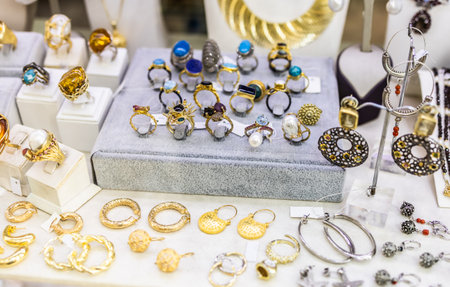 Collection of handcrafted rings and earrings with colorful stones on display. Artisan jewelry, elegant accessories and luxury market style.