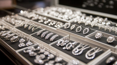 A wide-angle view of a jewelry store display featuring a selection of diamond earrings, with various designs and settings elegantly presented.
