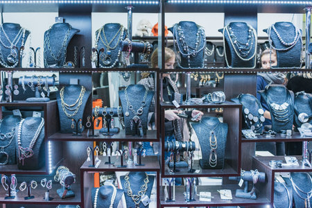 Stylish ornaments for sale on glass shelves of bijouterie boutique