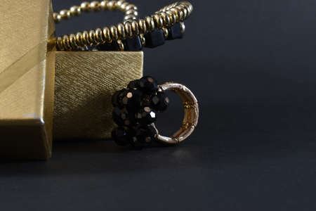 Rose gold fashion ring decorated with dark brown smoky quartz and beaded bracelet over glitter background.