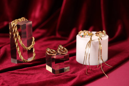 Stylish presentation of gold jewelry and red cloth on pink background, closeup