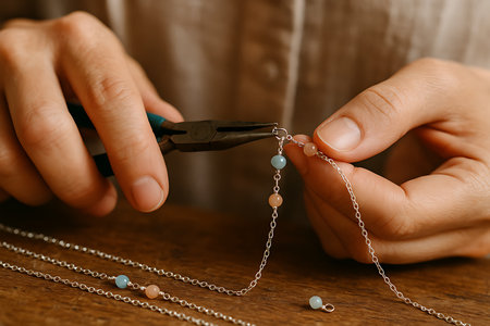 Close-up of a person's hands meticulously using jewelry pliers to attach a small, delicate gemstone bead to a silver chain, showcasing the intricate process of handmade jewelry making on a rustic wooden table.
