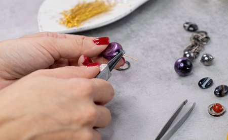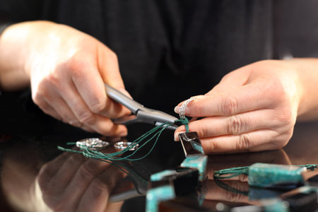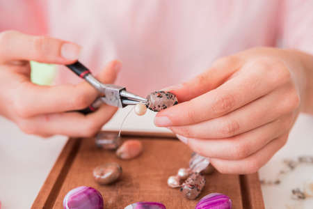 Close up of hands woman jewelry designer. She is sitting at a workspace with tools on it and is creating jewelry by stringing beads on fishing line. The process of creating jewelry. Small business.