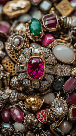 A vibrant array of vintage decorative jewelry featuring colorful gems and intricate designs. Perfect for showcasing beauty and elegance in adornments.