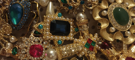 A vibrant array of vintage decorative jewelry featuring colorful gems and intricate designs. Perfect for showcasing beauty and elegance in adornments.
