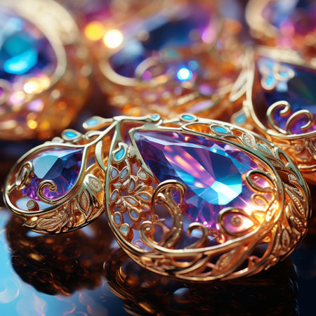 Close-up of an elaborate gemstone jewelry piece sparkling with colors