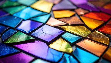 Explore a stunning close-up image featuring a vibrant mosaic texture with colorful reflections. Ideal for artistic projects, backgrounds, and creative designs.