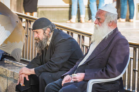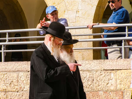 Two aged religious Jewish men stand on the square near the Western Wall and talk. Jerusalem, Israel: 24 October, 2018