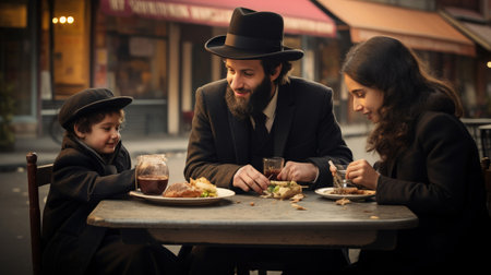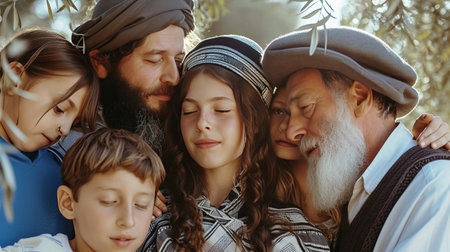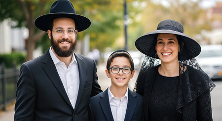 Jewish family in traditional clothing, standing outdoors, highlighting cultural heritage and community spirit, embodying faith and family values in a lively neighborhood atmosphere