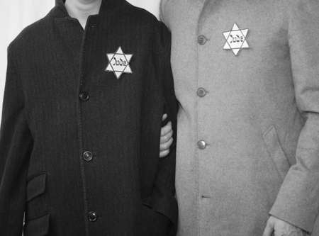 Jewish father and young son with winter coats and the symbol of the Star of David with the text Jude in black and white effect