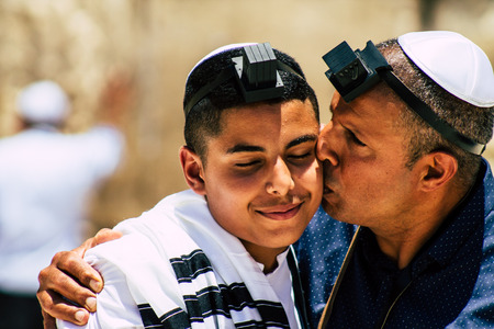 Jerusalem Israel June 24, 2019 View of young Israeli child walking front the Western wall in the Old city of Jerusalem in the afternoon