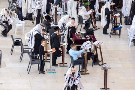 Jerusalem, Israel - 15/04/2015. Orthodox Jewish men pray at western wall in the morning