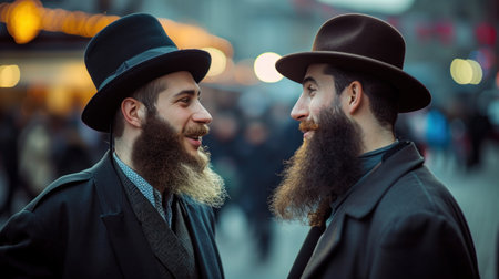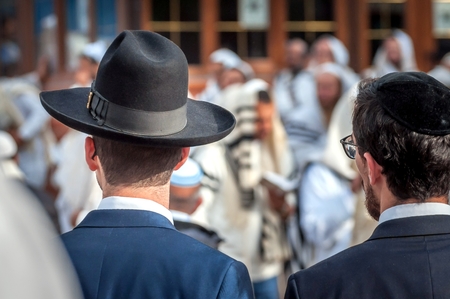Two adult Hasidim in traditional Jewish headdresses hat and kippah. Prayer of Hasidim.