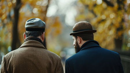 Back side Two Jewish male wearing skull cap and talking