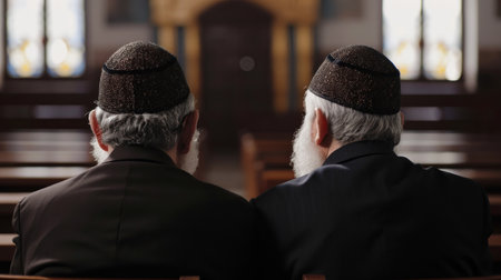 Two Jewish men are engaged in prayer, reading sacred texts in a synagogue, surrounded by elegant chandeliers and wooden pews, reflecting a deep sense of spirituality and community