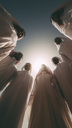 Group of Muslim people wearing traditional clothes at the celebration of Ramadan Kareem.