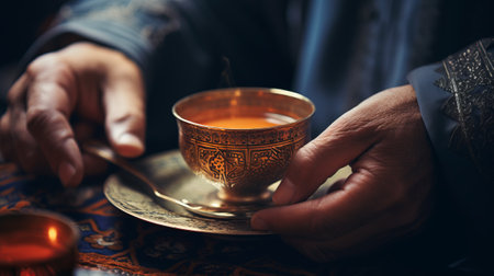 Old vintage antique royal dishes and appliances in the hands. Arabian or Turkish traditional tea time