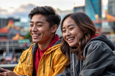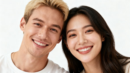 A joyful young couple shares a tender moment, their faces close and smiles bright, conveying warmth and connection.