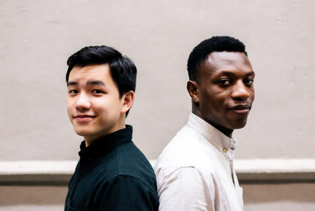 Teenager and young man of different nationalities smiling together in the studio in light and darkness