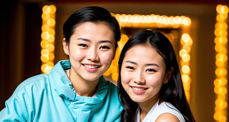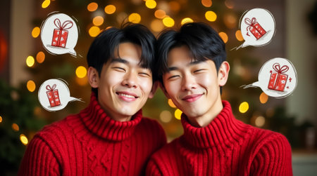 Two young men with Asian features sit close together, eyes closed and smiling, dreaming of gifts and holiday cheer in a festive setting adorned with twinkling lights.