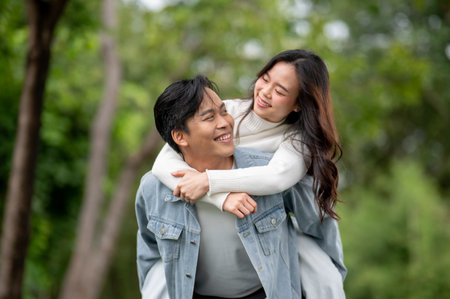 Young asian couple a woman hugging man's shoulder while getting piggyback walking outdoors in park.. Dating activity, Nature Healing, Chilling Outside.