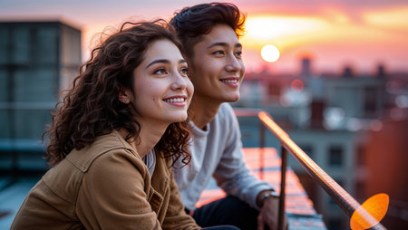 Young couple enjoying a sunset view on a rooftop in an urban setting during the evening