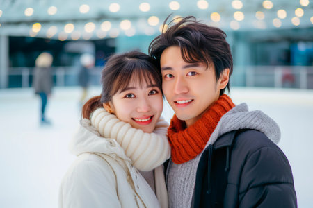 Casual portrait of a young Japanese couple enjoying winter holidays doing ice skating