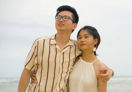 sweet and romantic lifestyle portrait of young happy Asian Chinese couple in love enjoying holiday on beautiful beach walking together by the sea playful and affectionate in relationship concept