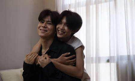 LGBTQ - Asian male homosexual couple love happiness concept. Homosexual male hugging and enjoying time together., radiating happiness.