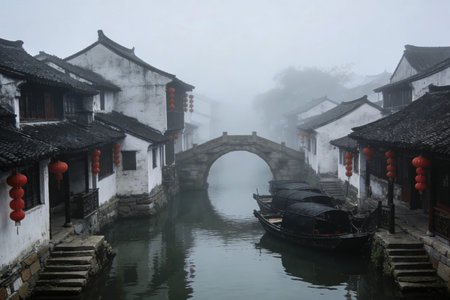 Fog is covering a river running through a village of traditional houses with an old stone bridge arching over it