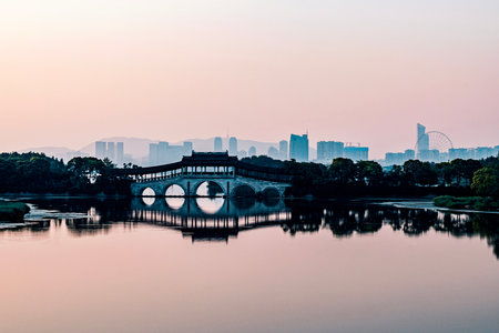 Beautiful architecture building landscape of Hangzhou city skyline at sunset, China.