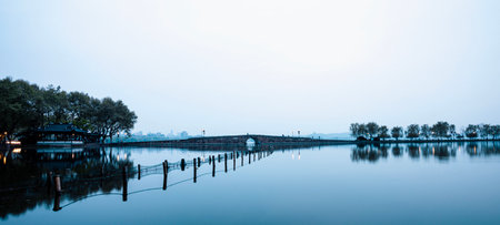 Aerial view of Hangzhou West Lake Tower at sunset, China