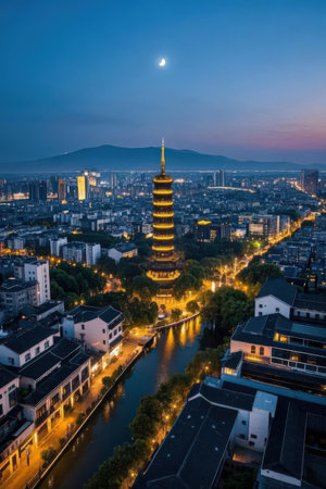 Aerial view of Suzhou city at sunset, Jiangsu Province, China.