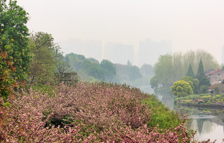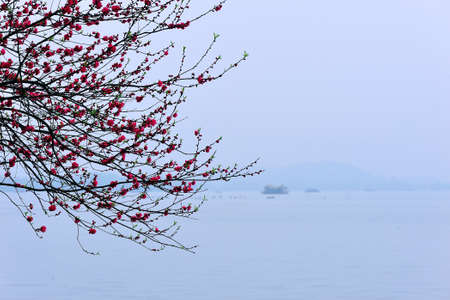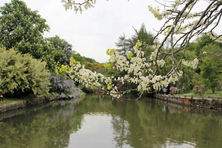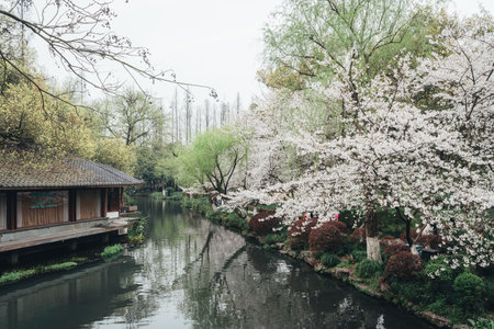 Cherry Blossoms in a cloudy day at Quyuan Garden of Hangzhou West Lake, Hangzhou, China