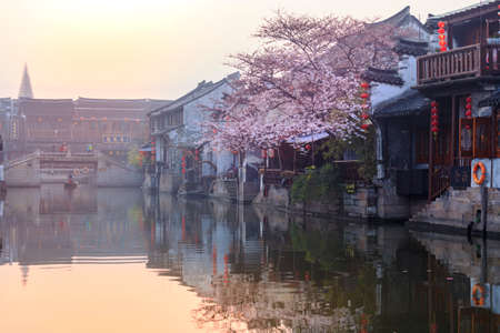 China water town Xitang. Traditional chinese architecture buildings and blooming trees