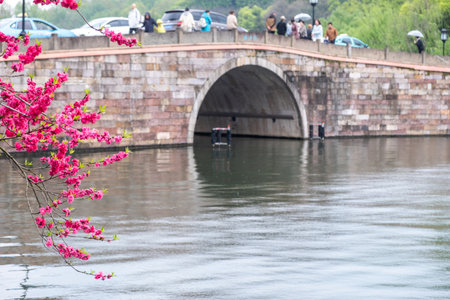 West Lake, Hangzhou. China. Bright pink spring blossoms in Spring and a stone bridge. People walking and cars crossing the bridge