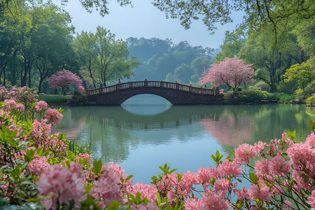 A picturesque bridge over a tranquil lake, surrounded by vibrant pink azaleas and lush greenery.