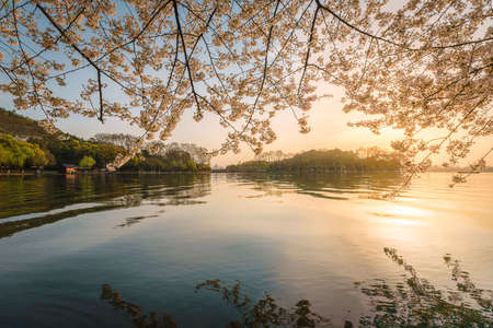 Spring cherry blossom scenery at Hangzhou West Lake under the sunlight, Hangzhou, China