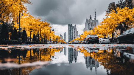 A street scene depicts a city avenue lined with trees displaying vibrant yellow foliage. The image features a shallow depth of field, with reflections in a puddle. The overcast sky and buildings create a muted backdrop, lending a mood to the composition. Suitable for environmental or urban-themed visuals.