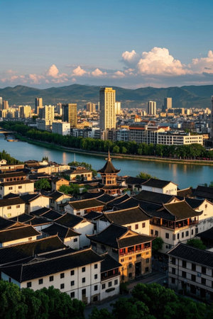Ancient and modern urban architecture and river landscape