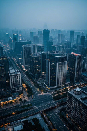 Aerial view of a sprawling cityscape with modern skyscrapers under a hazy sky