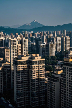 City skyscrapers and distant mountain landscapes