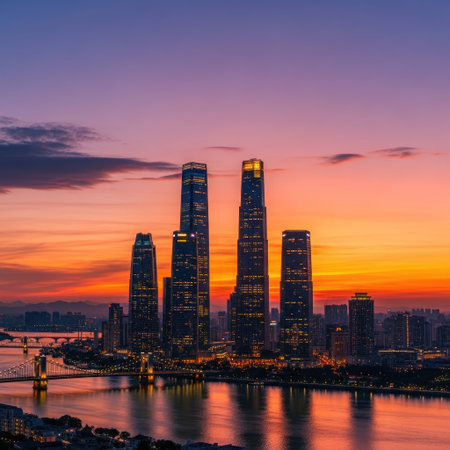 cityscape of Seoul at dusk with Yeouido Park underneath