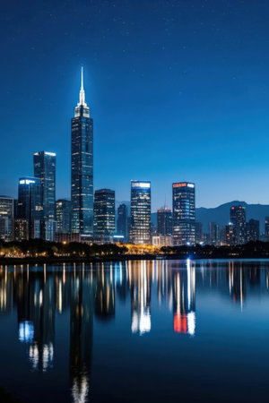 City night view of tall buildings and reflections on the water