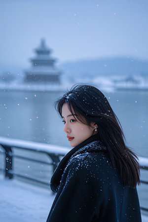 Beautiful asian woman in the snow at Gyeongbokgung Palace, Seoul, South Korea