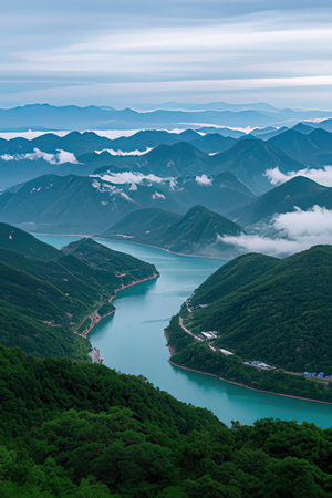 Aerial view of green hills and lake in the morning, China