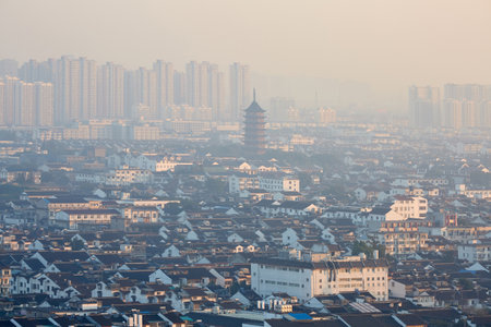 Aerial view of ancient pagoda and residential buildings in foggy Suzhou city, China