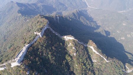 Aerial view of Great Wall of China. Famous landmark Great Wall and mountains located in Hebei province next to Beijing.