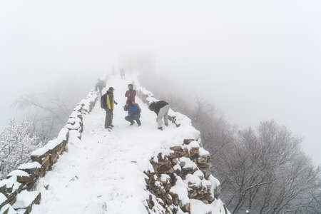 Foggy view in winter weather at The Great Wall Mutianyu in Beijing, China.