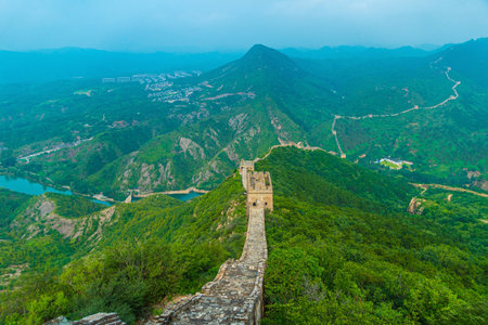 A panoramic view on a renewed Jinshanling part of Great Wall of China. The wall is spreading on tops of mountains. Many watchtowers on the peaks. Dense forest around it. World wonder. Tradition